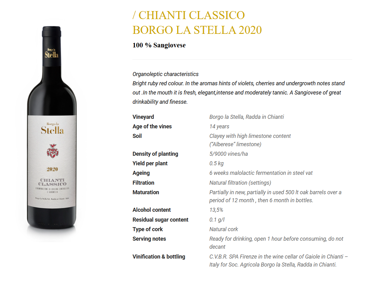 Denne klart rubinrøde Chianti Classico fra 2020 stråler af liv. Allerede ved første duft mødes man af sarte violer, saftige kirsebær og lette skovbundsnoter, der giver vinen karakter og dybde. I smagen er den frisk og intens, men samtidig elegant og silkeblød med en moderat tanninstruktur, der giver balance og længde.